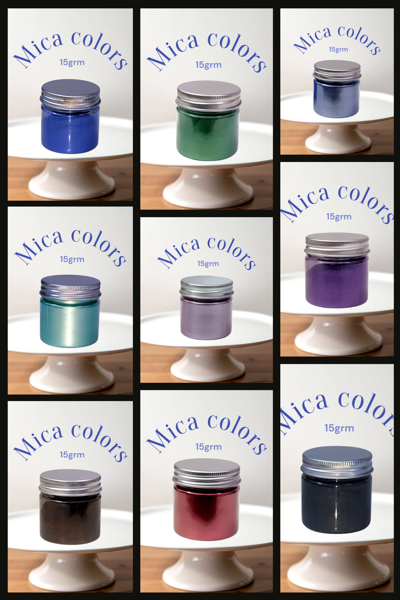 Mica colors for resin, candles and soap. Package contains 9 color packs. Each pack contains 15 mica powders.