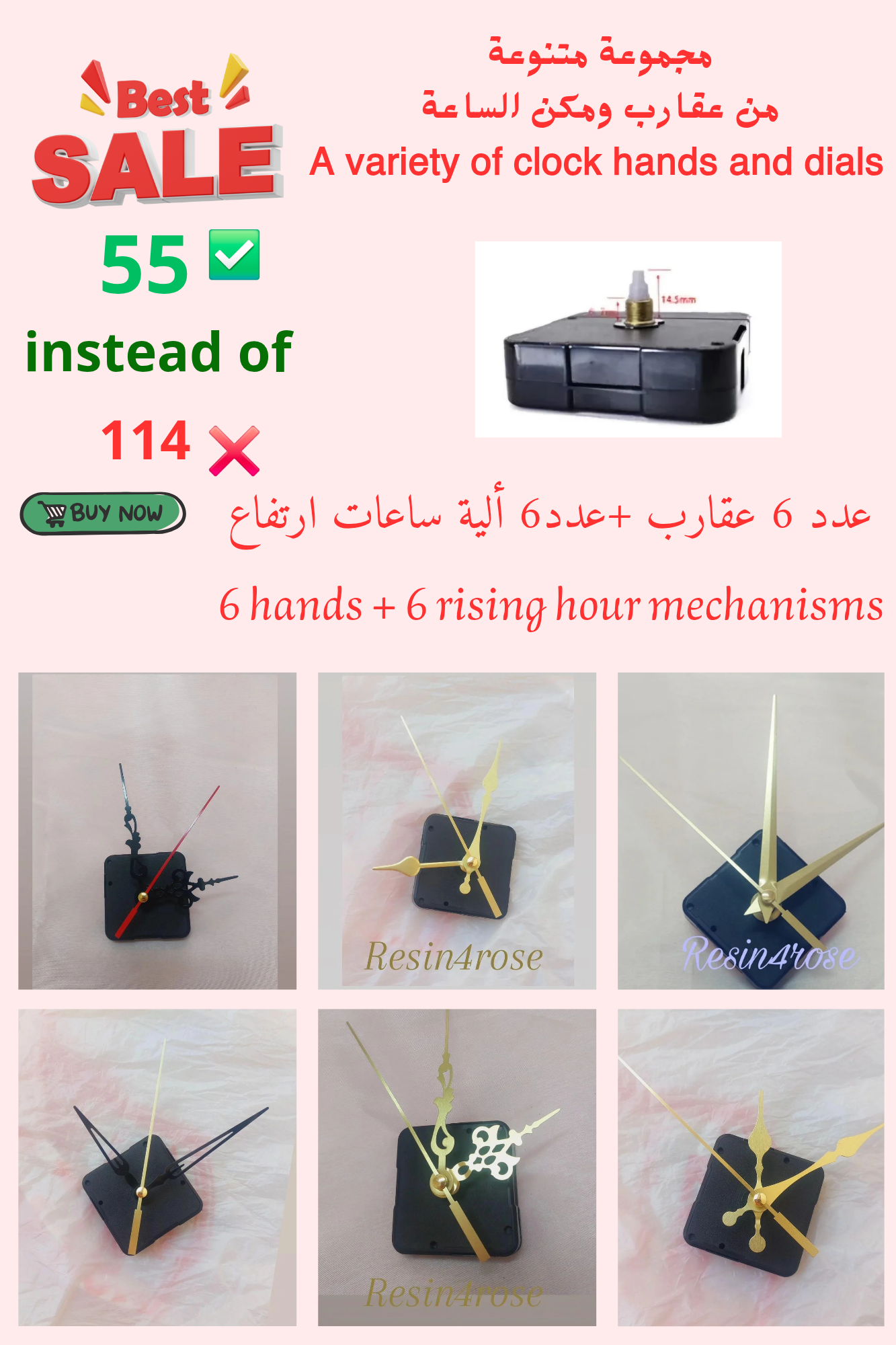 A package of a clock mechanism and clock hands in various shapes and colors. Choose the height of the mechanism that suits the depth of the wood you are using. The set consists of 6 clock mechanisms with 6 hands in various colors, gold and black.