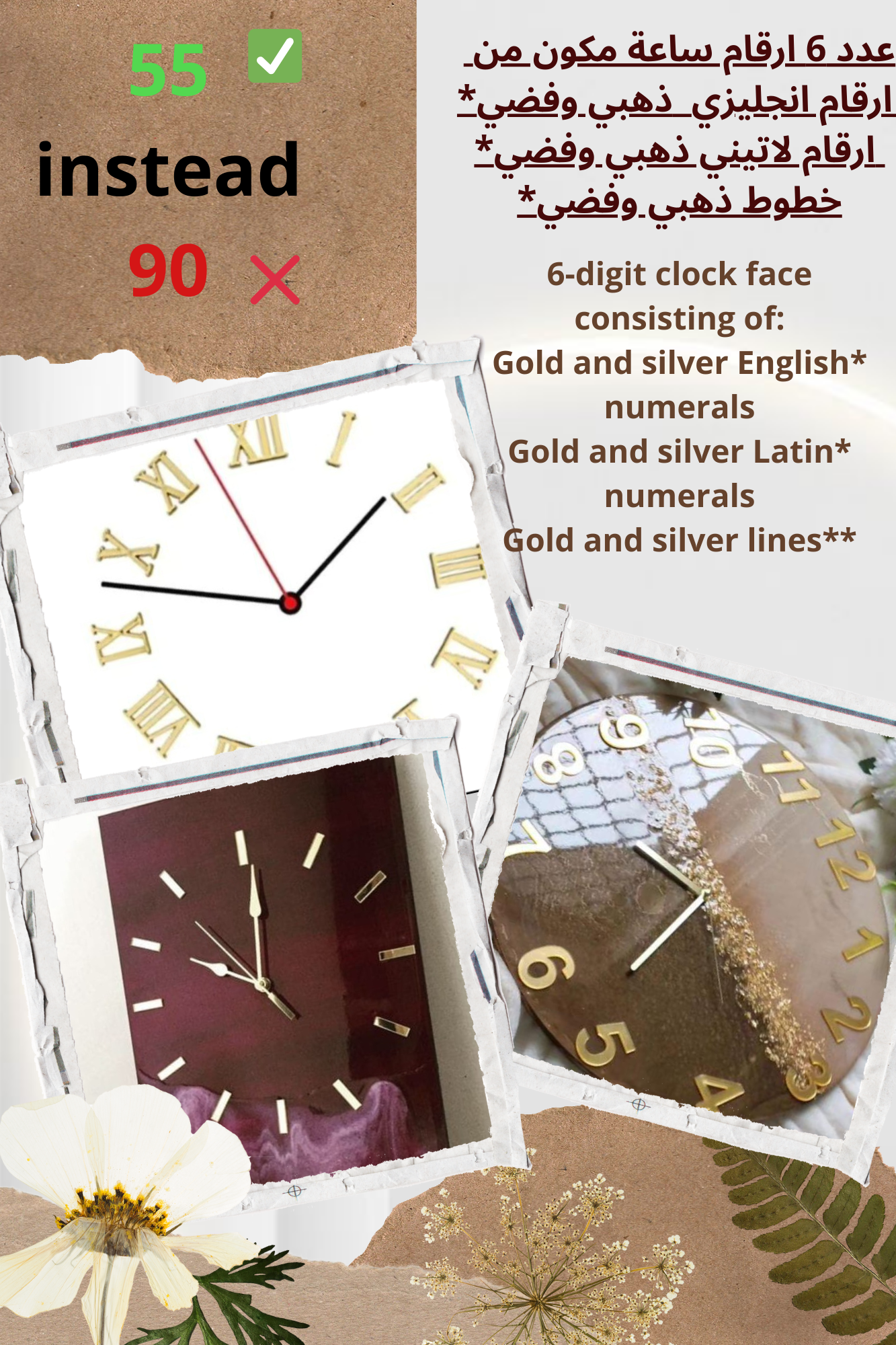 A set of English and Latin acrylic clock numbers and lines for use on wall clocks and with luxury resin plaques. The set consists of gold and silver Arabic clock numbers, gold and silver Latin numbers, and gold and silver numbers with lines.